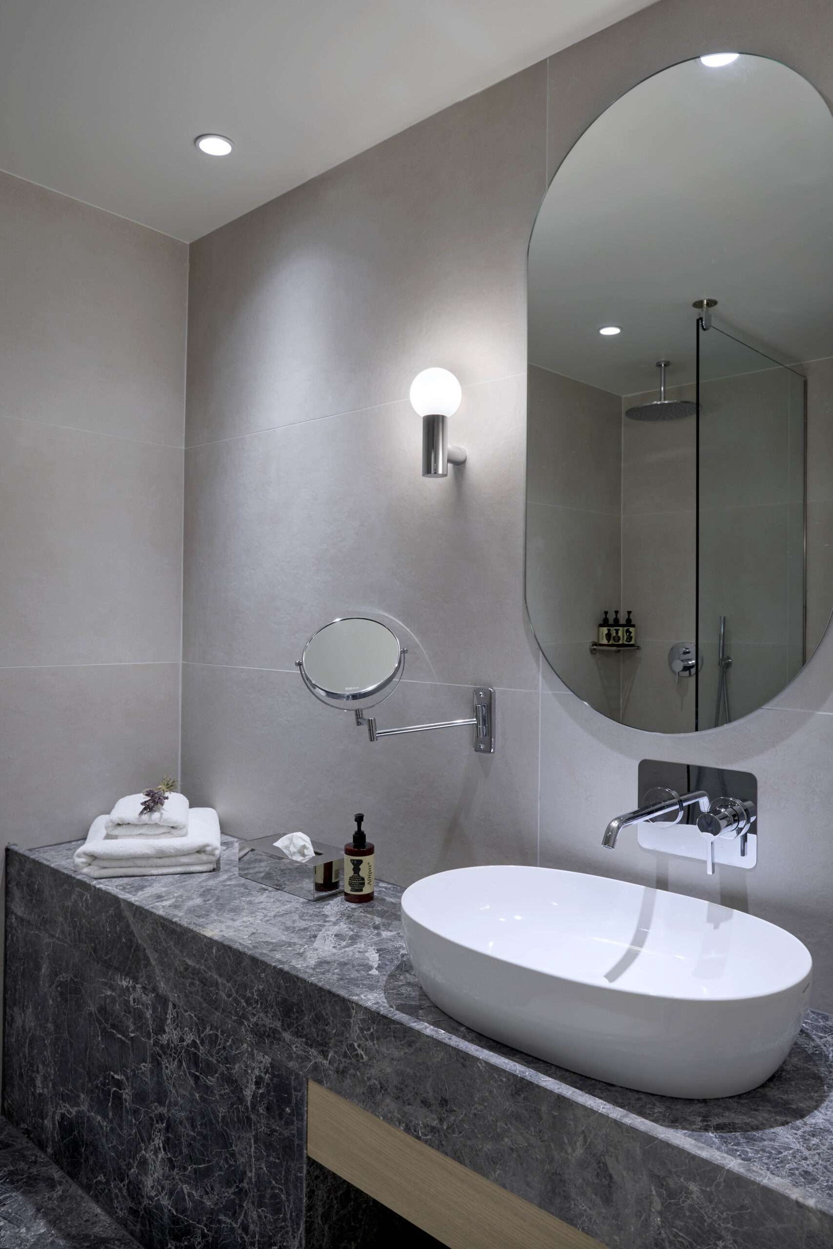 The 35 sq.-meter room on the ground floor boasts cozy colors, Mediterranean-inspired design, and natural light, complementing the elegant interiors.