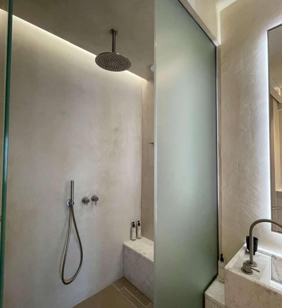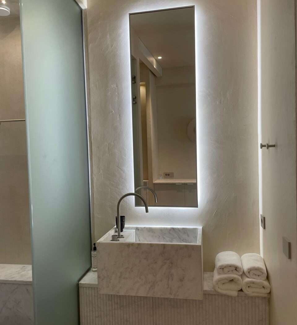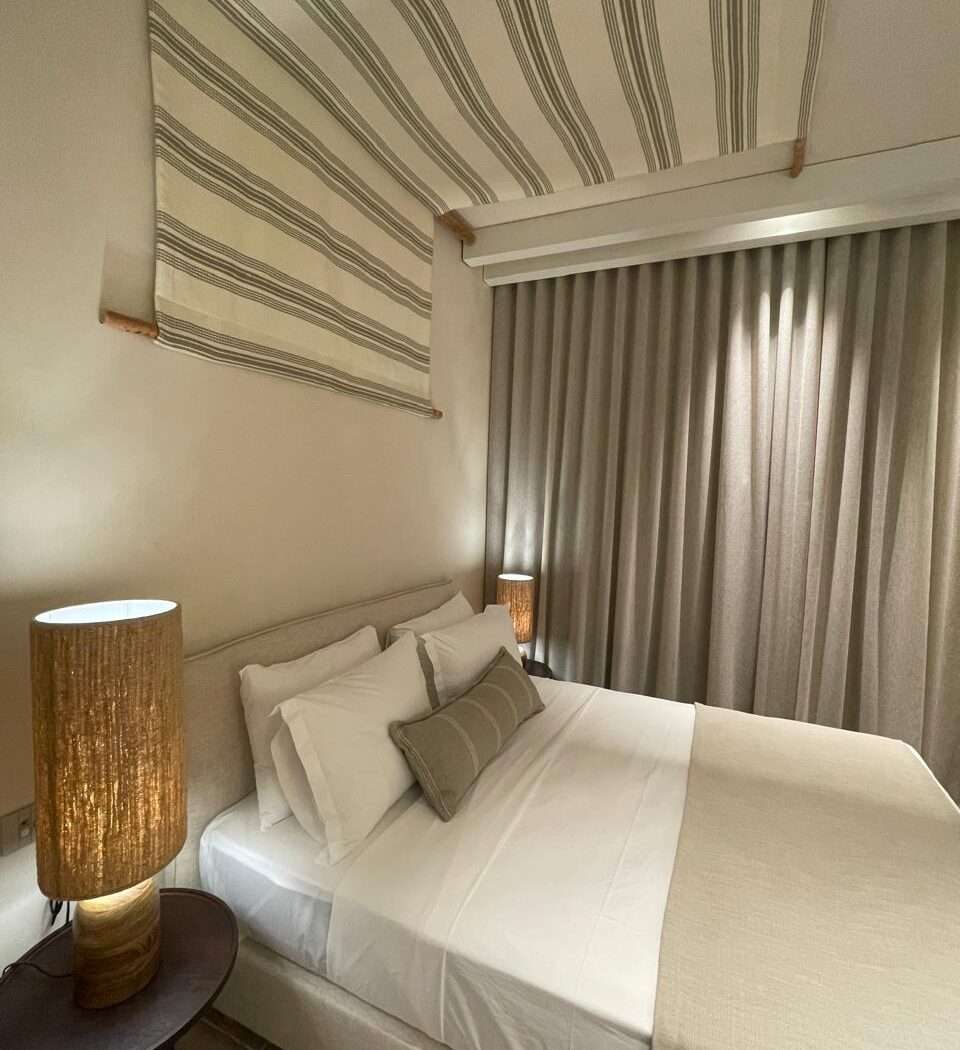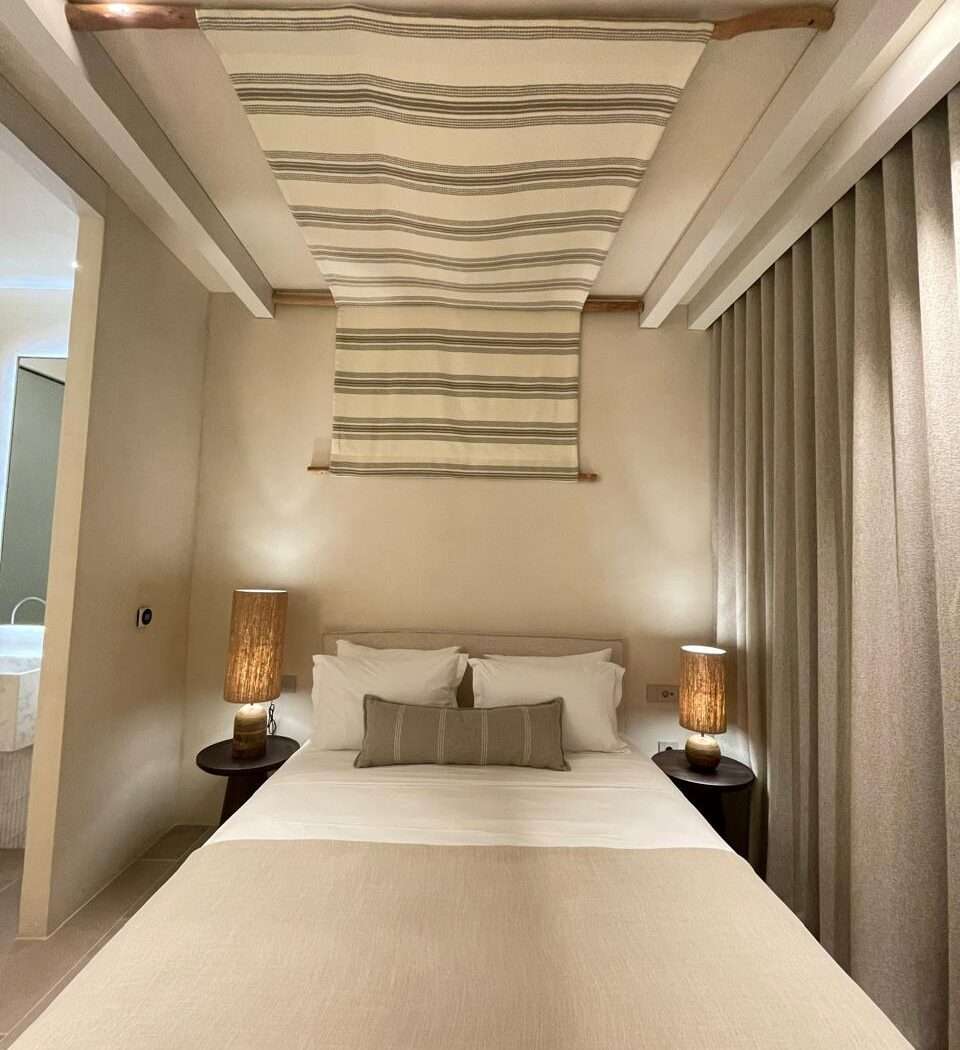 The highlight is the furnished private balcony, an inviting spot for slow mornings with coffee, afternoon pauses in the shade, or sunset breezes after a day on the island. Natural light, soft décor, and a calm color palette create an atmosphere that is both warm and effortless.
